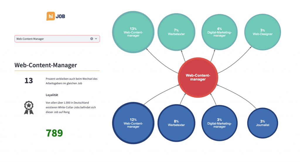 Und nicht nur das – auch die nachfolgenden Karriereentscheidungen werden nun sichtbar gemacht. Im konkreten Beispiel ist somit erkennbar, dass Web-Content-Manager*innen nur in 13% der Jobwechsel im gleichen Job bleiben. Zu 7% werden sie Werbetexter*innen, zu 4% Digital-Marketing-Manager*innen und in 3% Web-Designer*innen.