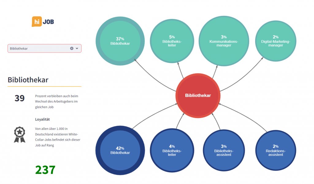 Hier siehst du zum Beispiel, dass 2% aller Bibliothekar*innen später einmal ins Digital Marketing wechseln. Bitte beachte, dass es sich hier um eine Dummy-Grafik handelt. Im finalen Tool wird alles natürlich noch viel besser aussehen 😉